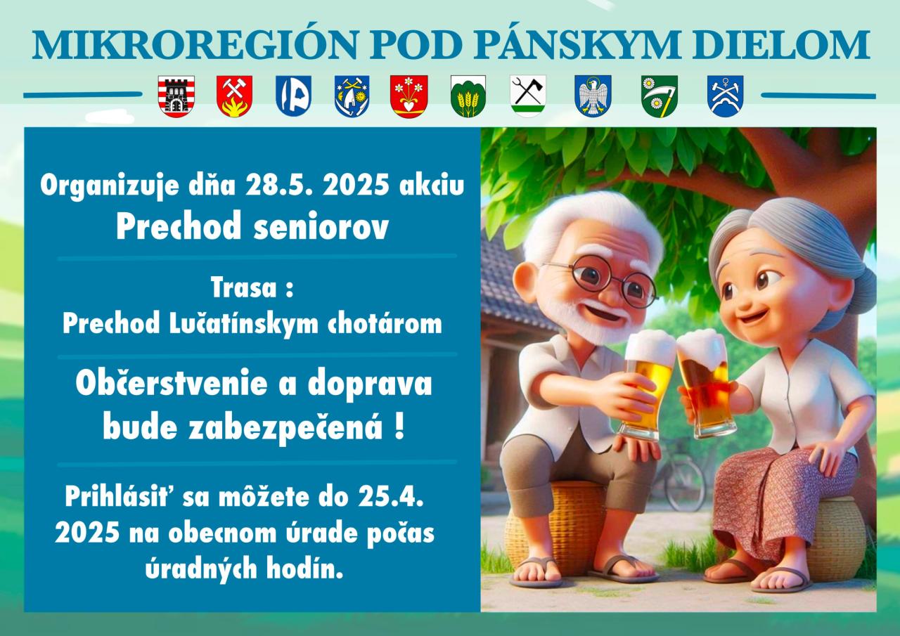 Mikroregión Pod Pánskym Dielom organizuje dňa 28.5.2025 akciu Prechod seniorov. Prihlásiť sa môžete do 25.4. na obecnom úrade.
